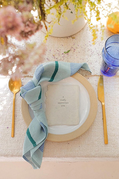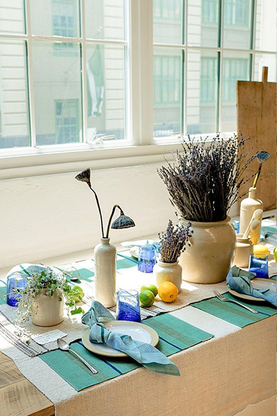 SOIL TO STUDIO: Explore the curated selection of tablescapes and tabletops at Soil to Studio in The Makers Guild. The modern handcrafted home textiles studio collaborates with craftsmen of India from master weavers, block-printers + dyers. See their collection here.