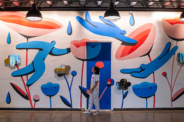 Tsaih’s mural installation titled “After The Rain” shows figures gathering amongst flowers blooming under rain drops, symbolizing a celebration of coming together after a prolonged period of isolation. The artwork, created in collaboration with Industry City tenant Fabberz, responsible for the 3D fabrication on the project, is intended to remind spectators of the lightness that comes after darkness and the importance of both our vulnerabilities and our resiliencies, as individuals and as a community.
