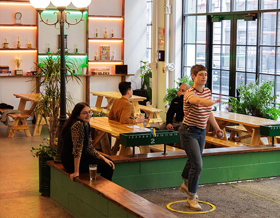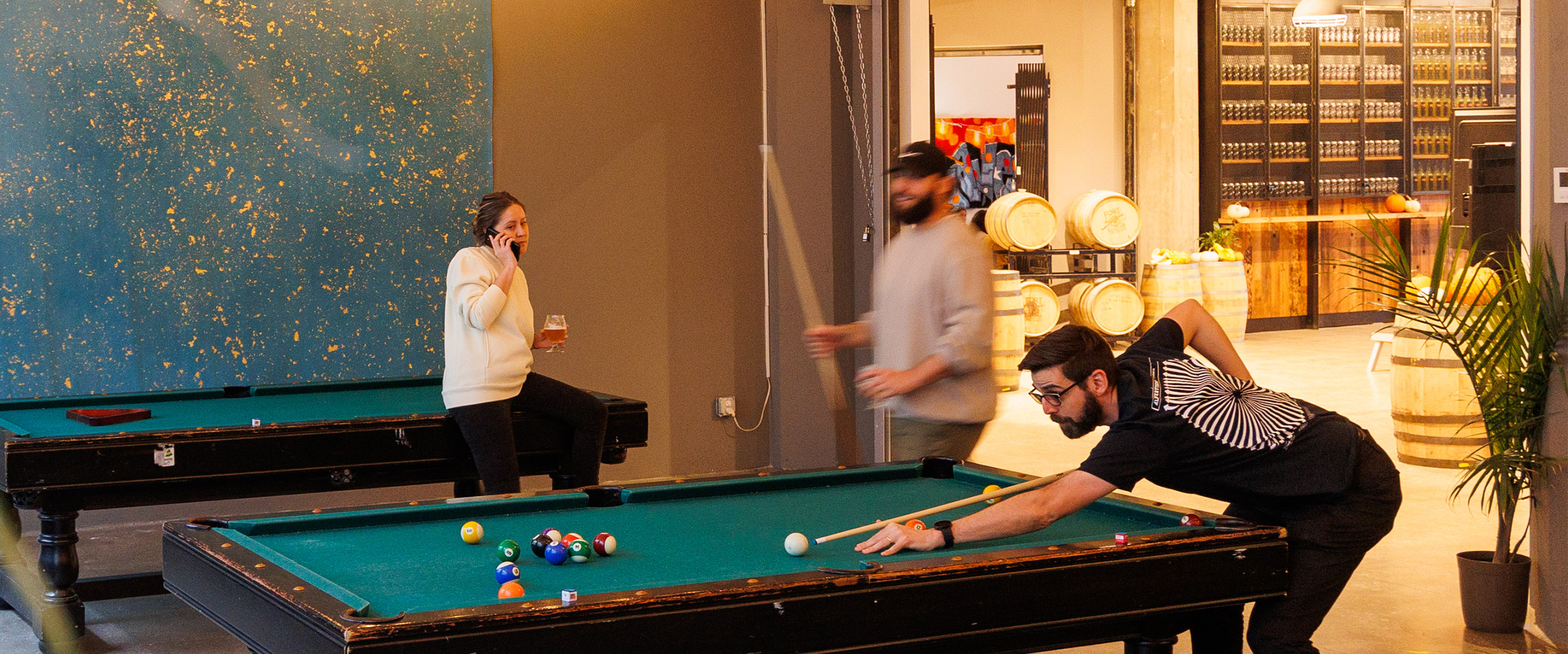 Neighboring Fort Hamilton Distillery + Gun Hill Brewing, The Saloon is a two-part recreational space to enjoy your Brewers + Distillers drinks. Lounge and relax or take to the pool...