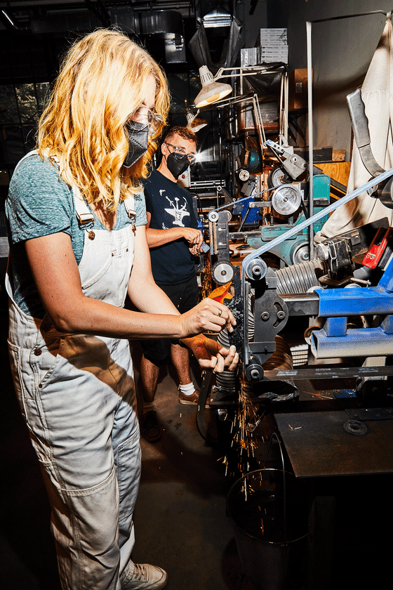 We keep working, refining the edge of the blade on what looks like a giant conveyor belt of sandpaper. This is what sends sparks flying. I am playing it cool, or at least I think I am, but each part of the process is more mesmerizing than the last. There’s something very primal about it: working with your hands, using fire, making a tool so intimately connected to our survival as a species.