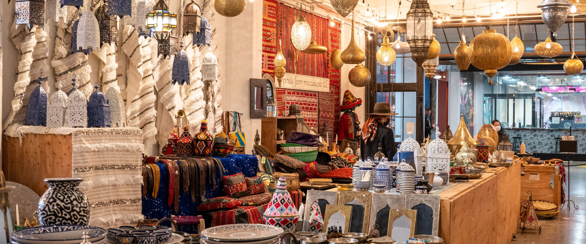 Moroccan grand bazaar warehouse featuring the latest ‘must-haves’ direct from the ancient Moroccan commerce center of Marrakech, including encaustic tiles, lighting, hand-woven carpets, and exotic home and fashion accessories.