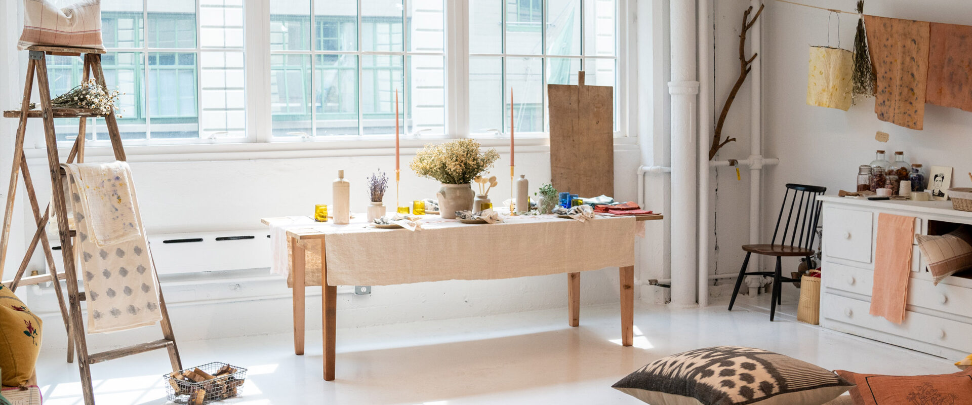 Brooklyn-based textile design + natural dye studio, Soil to Studio, is popping up for the month in The Makers Guild. This modern handcrafted home textiles studio collaborates with craftsmen of India from master weavers, block-printers + dyers. With a homewares approach to farm to table, Soil to Studio prides itself on zero waste, from fabric to food scraps.
